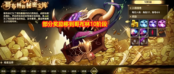 部分奖励整合到哥布林的秘密宝库10阶段之中,体验服未实装,只有策划的一纸公告,但按照查理以往的历史战绩,会让大家刷1个副本有好几倍奖励吗?所以免费卡片、70级白嫖史诗等福利必然削减。
